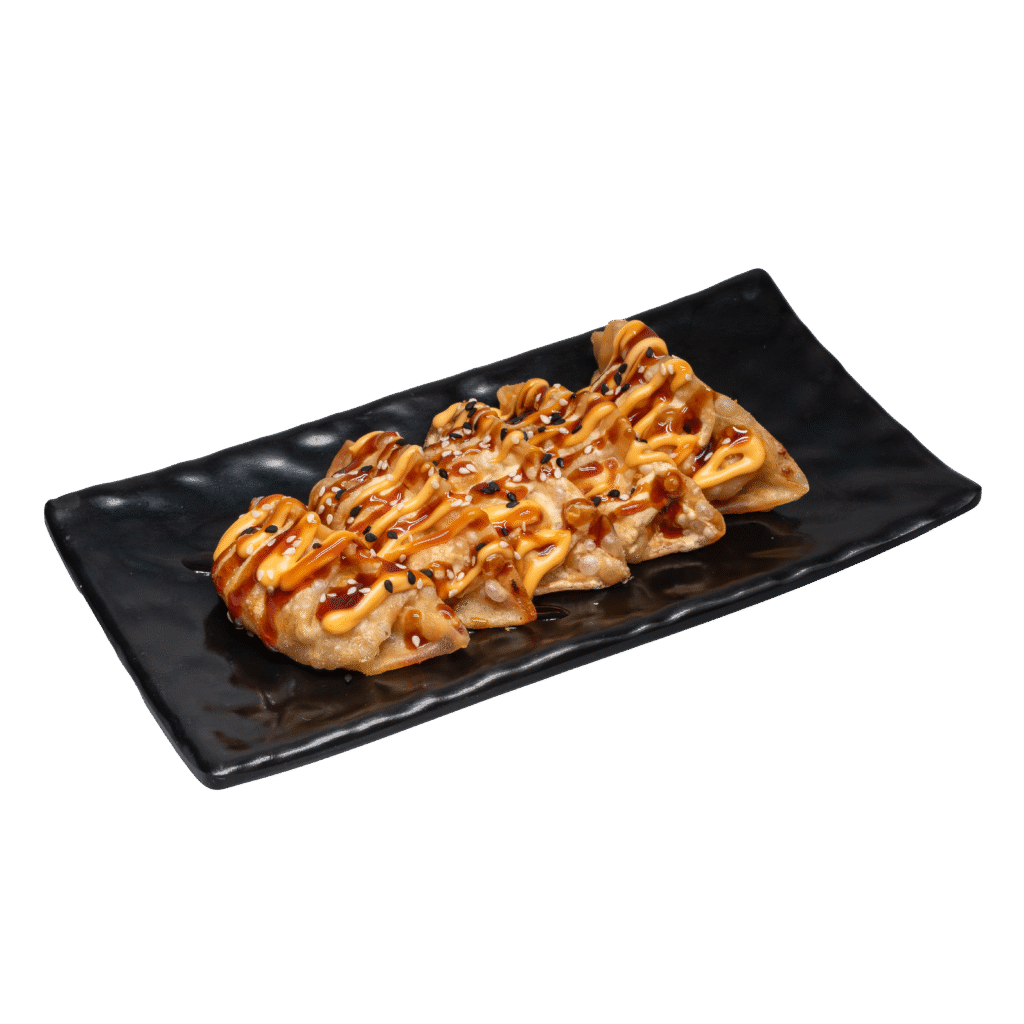 Gyoza di maiale fritti serviti con salsa spicy maio, teriyaki e semi di sesamo (5 pz)