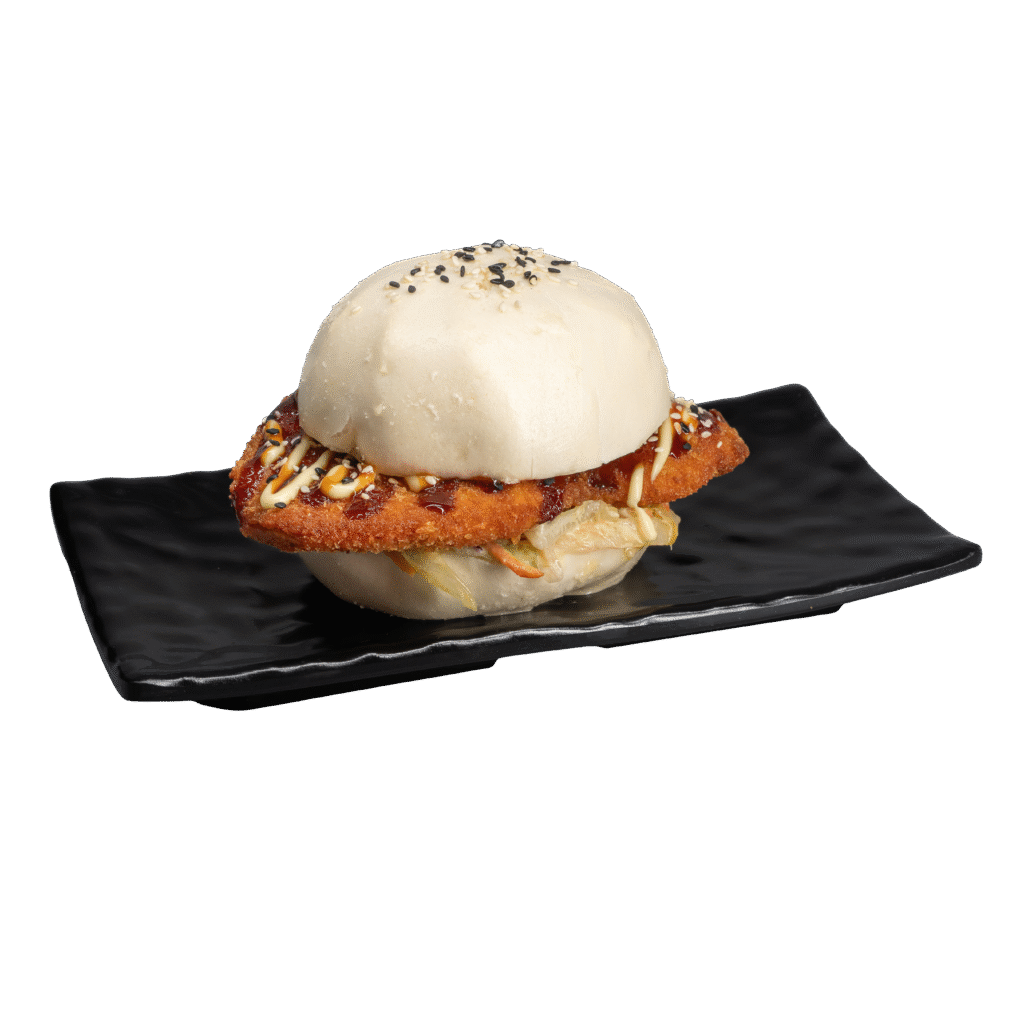 Bao burger con cotoletta di pollo croccante, salsa mayo e teriyaki, mix di insalata iceberg, carote, cavolo rosso, semi di sesamo