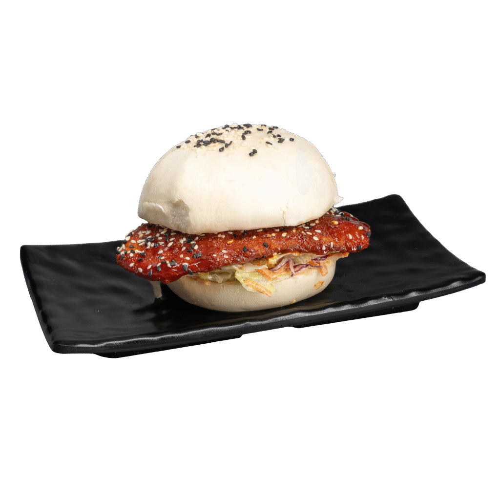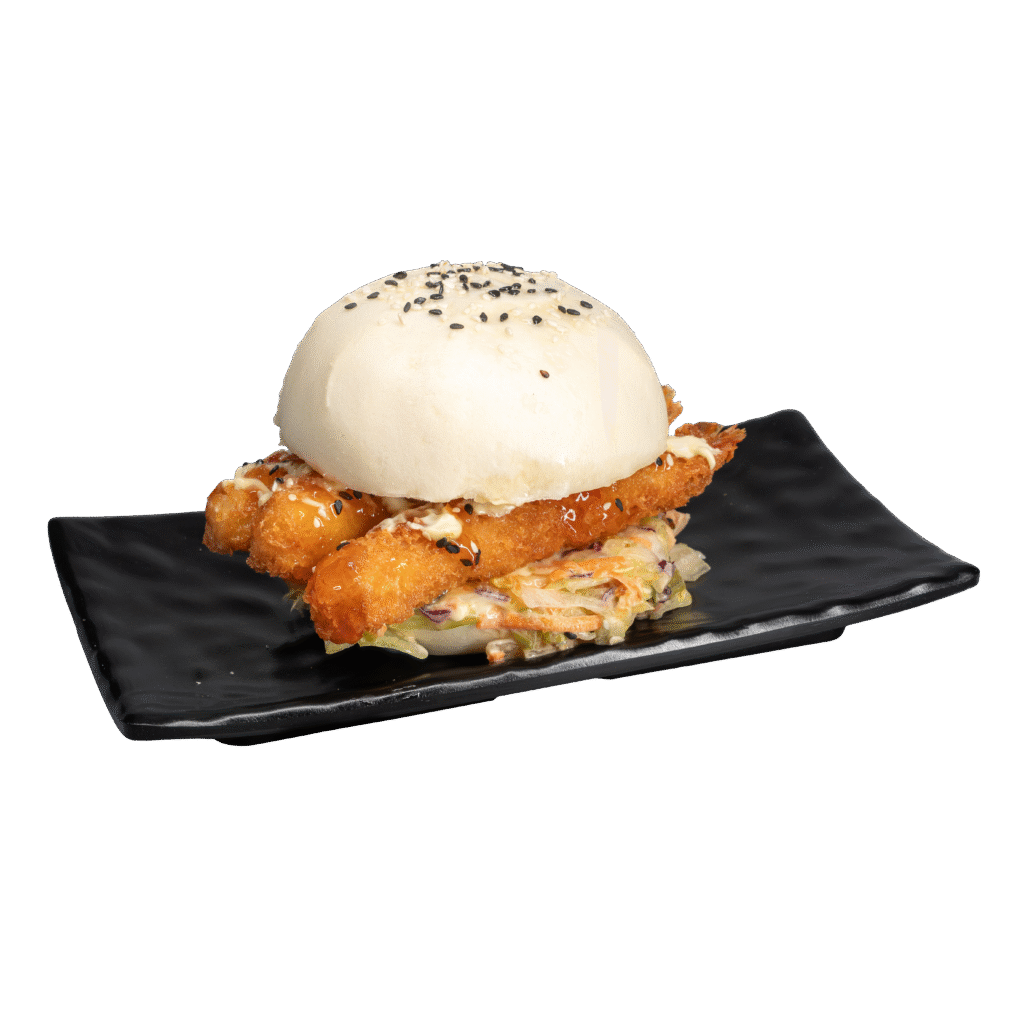 Bao burger con 3 pz golosi di gamberi fritti, salsa mayo e agrodolce con una nota piccante, mix di insalata iceberg, carote, cavolo rosso, semi di sesamo