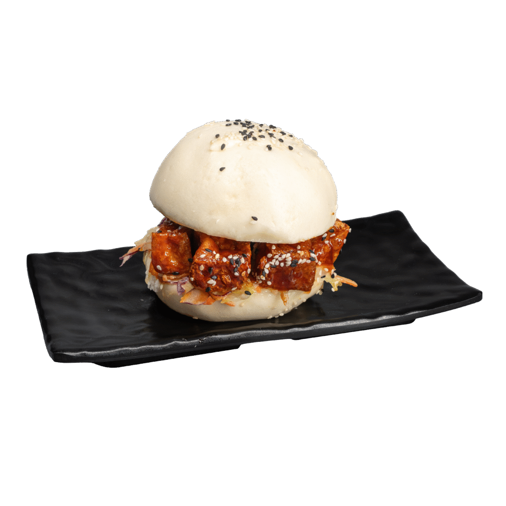 Bao burger con tofu fritto in salsa piccante coreana, maionese vegana, mix di insalata iceberg, carote, cavolo rosso e semi di sesamo
