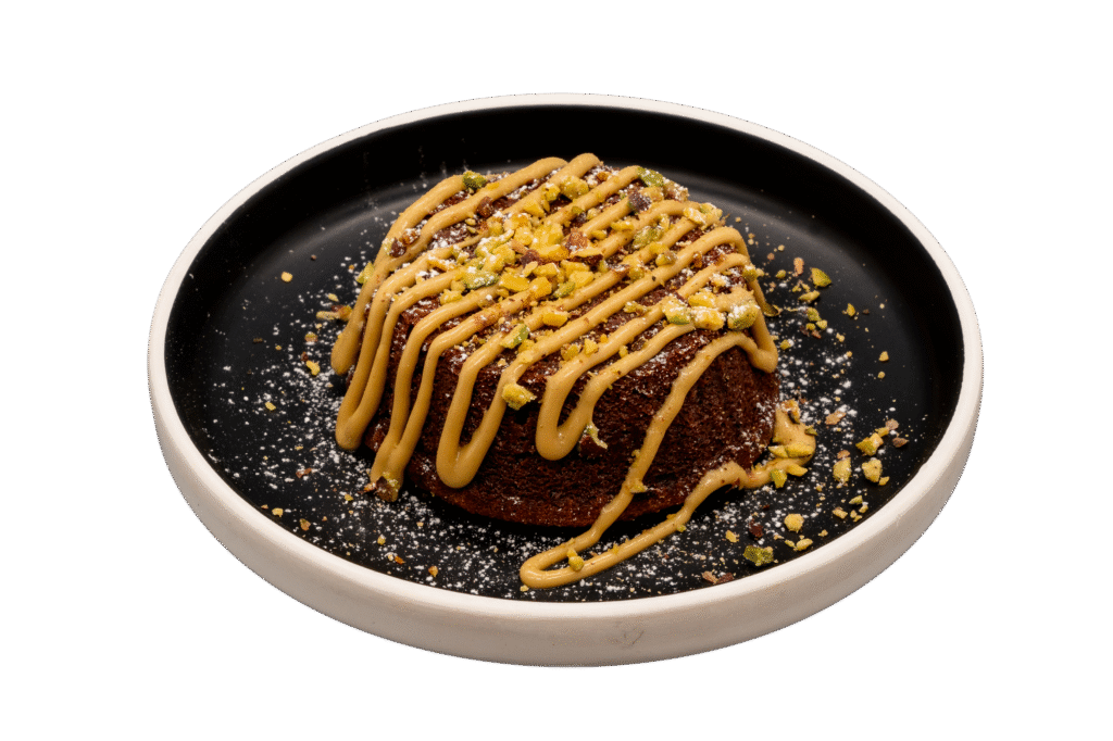 Tortino al cioccolato dal cuore morbido e caldo con salsa e granelle al pistacchio
